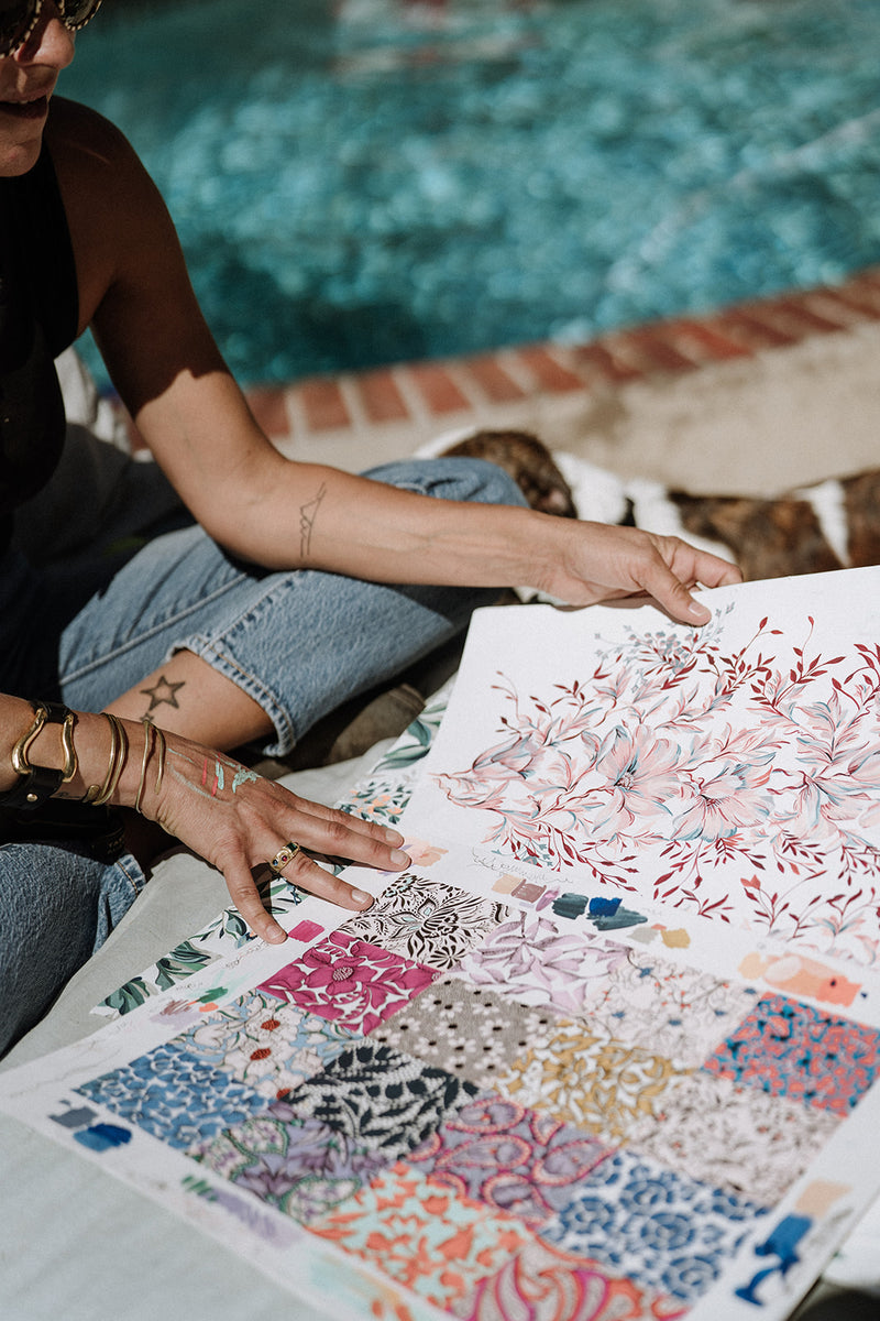 Alexandra Farmer’s work is distinguished by its color, expressive florals, and a free-flowing process that feels almost alchemical. UK-trained with more than 25 years in the world of print and pattern, she draws on British Arts & Crafts heritage while infusing her designs with a spirited sense of movement and imagination.