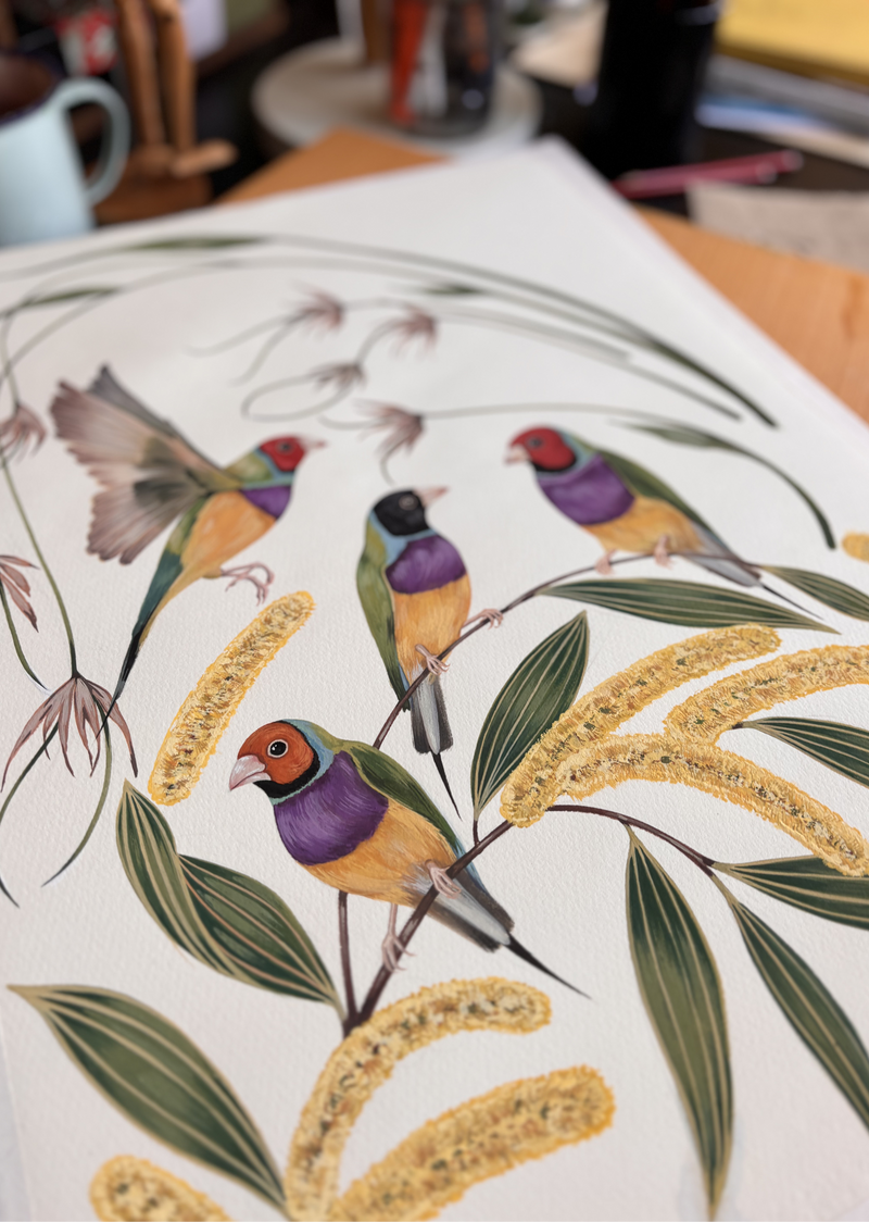 Based in Australia’s Blue Mountains, Eloise Short is a textile designer and illustrator known for hand-painted motifs inspired by native plants and birds. With formal training in fine art and textile design and more than 15 years of industry experience, her work has appeared in global fashion, home goods, and award-winning children’s books. Each collection begins with brush, paper, and close observation, then evolves into expressive repeats that honor the landscape she calls home. Her collaboration with Artscape celebrates craft, nature, and awe found in everyday surroundings.