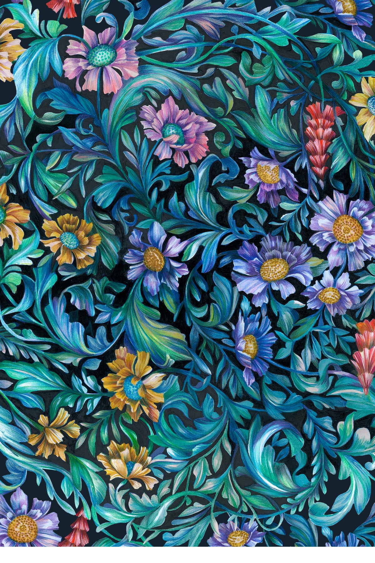 Starting with Panel 1, align the right side of the panel to your plumb line, allowing a slight overhang at the ceiling. Smooth the wallpaper onto the wall using a wallpaper brush or soft squeegee, working from the top down and center outward to remove air bubbles. Allow the bottom of the panel to slightly overlap the baseboard or floor. If adhesive gets on the front of the wallpaper, gently wipe it off immediately with a damp sponge, avoiding rubbing. Repeat these steps with your remaining panels in chronological order matching the design from the previous strip. Press panel edges together to ensure there isn’t a visual seam between the two panels.