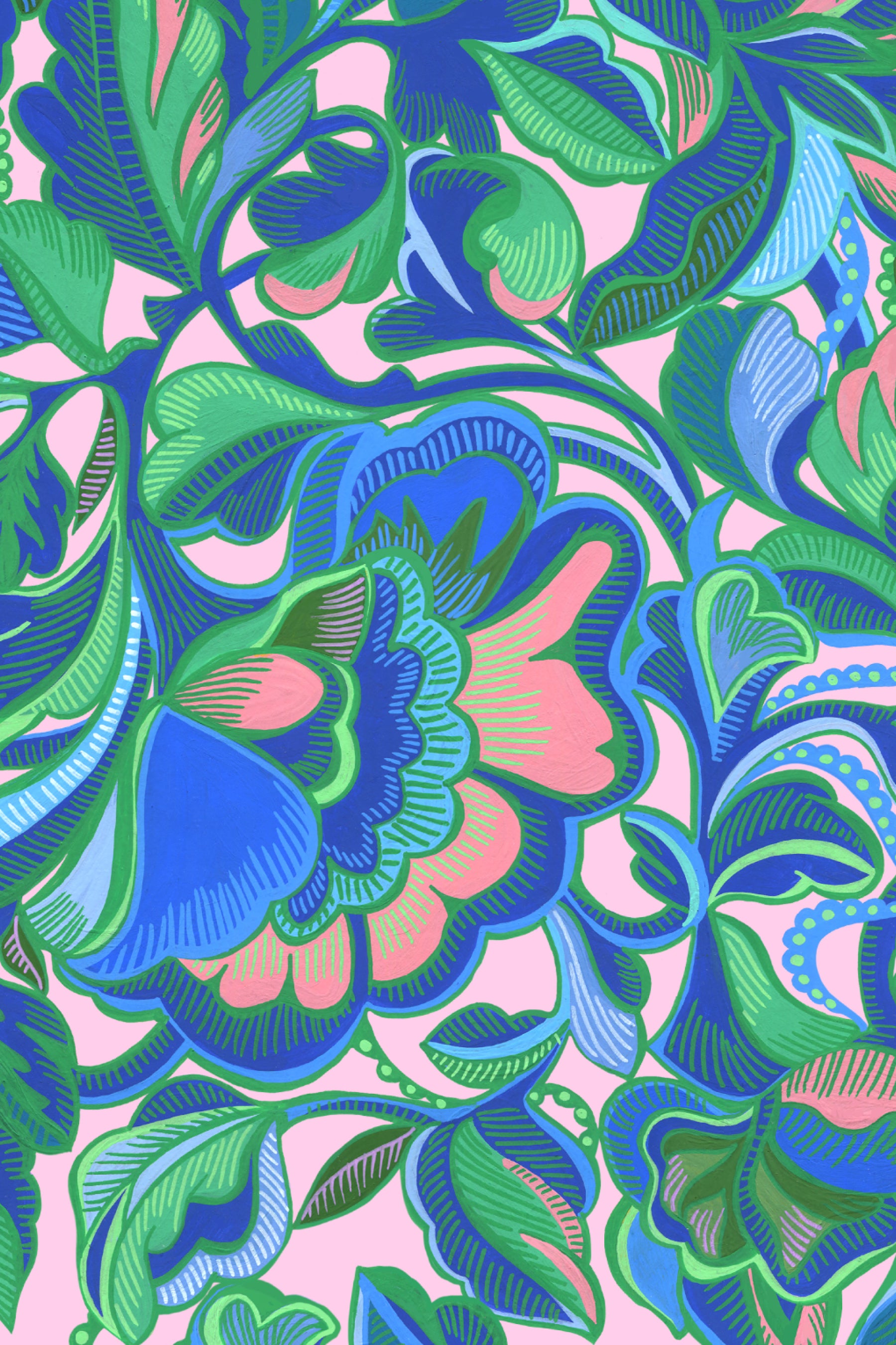 Georgia brings a fresh, modern twist to florals. With a soft pink ground and expressive blue blooms, this mural blends dots, lines, and painterly petals into a pattern that nods to paisley without losing its floral heart. Vibrant, textured, and full of movement, it’s a statement piece that feels very now.