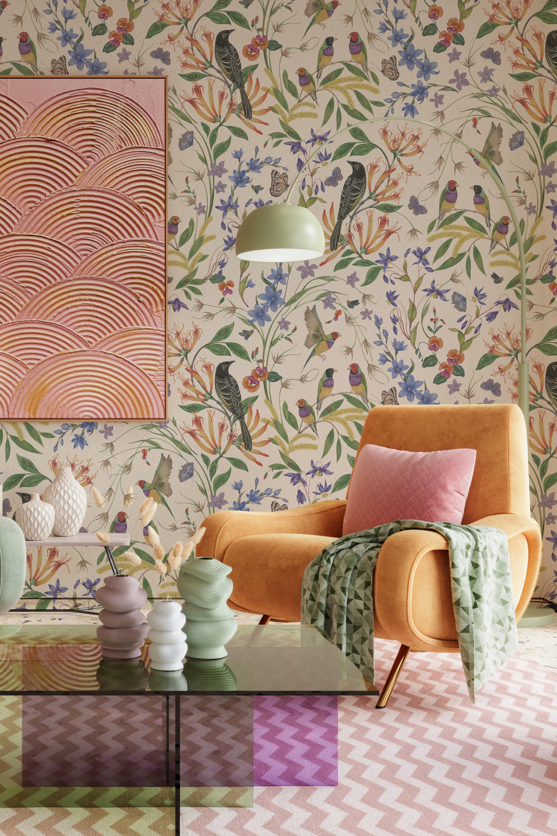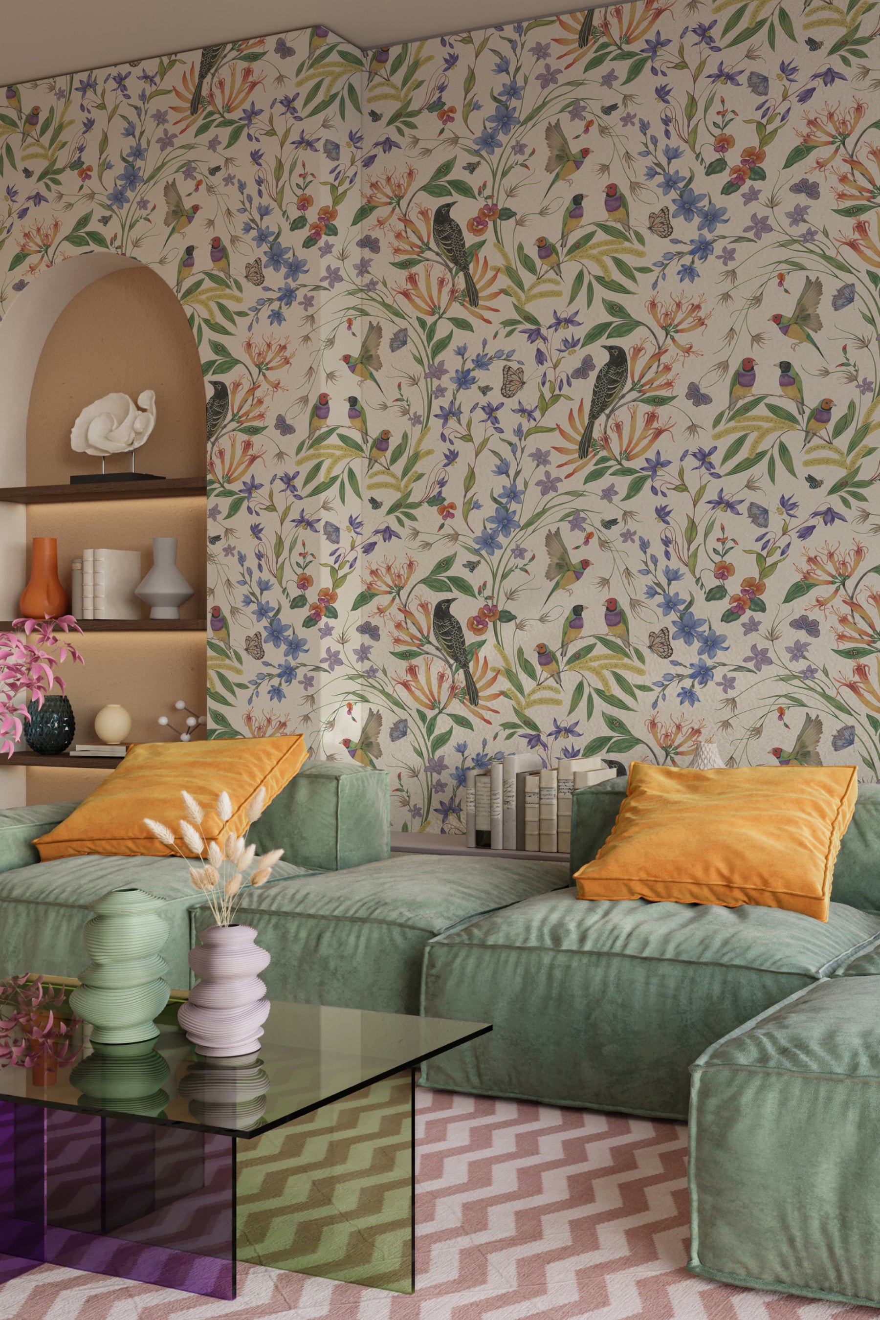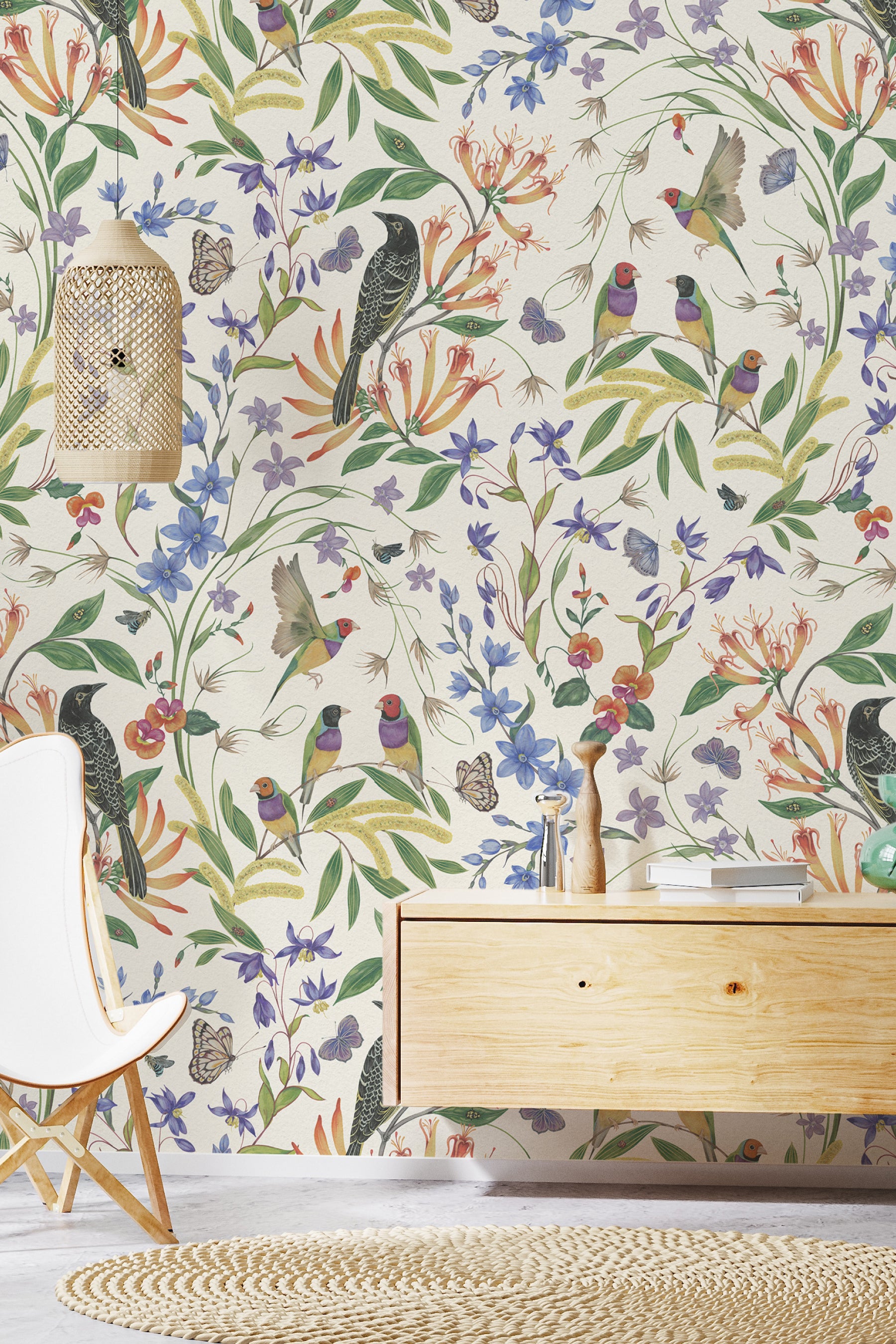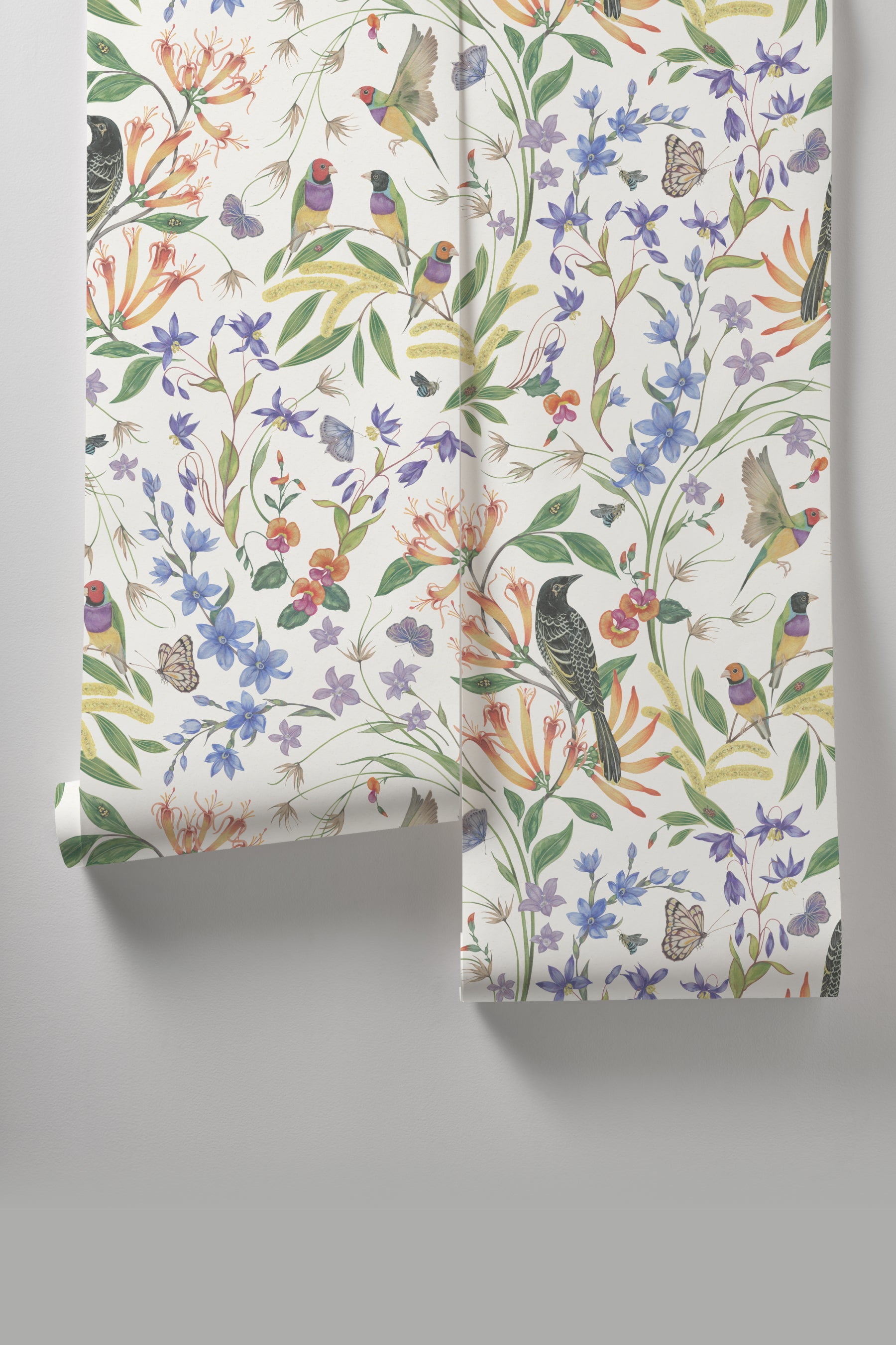 Painted in gouache by Australian artist Eloise Short, Megafauna is inspired by the rich biodiversity of the Blue Mountains. Delicate yet full of life, the design reveals tiny surprises at every glance: birds, bees, moths, and native flora woven together in harmony.