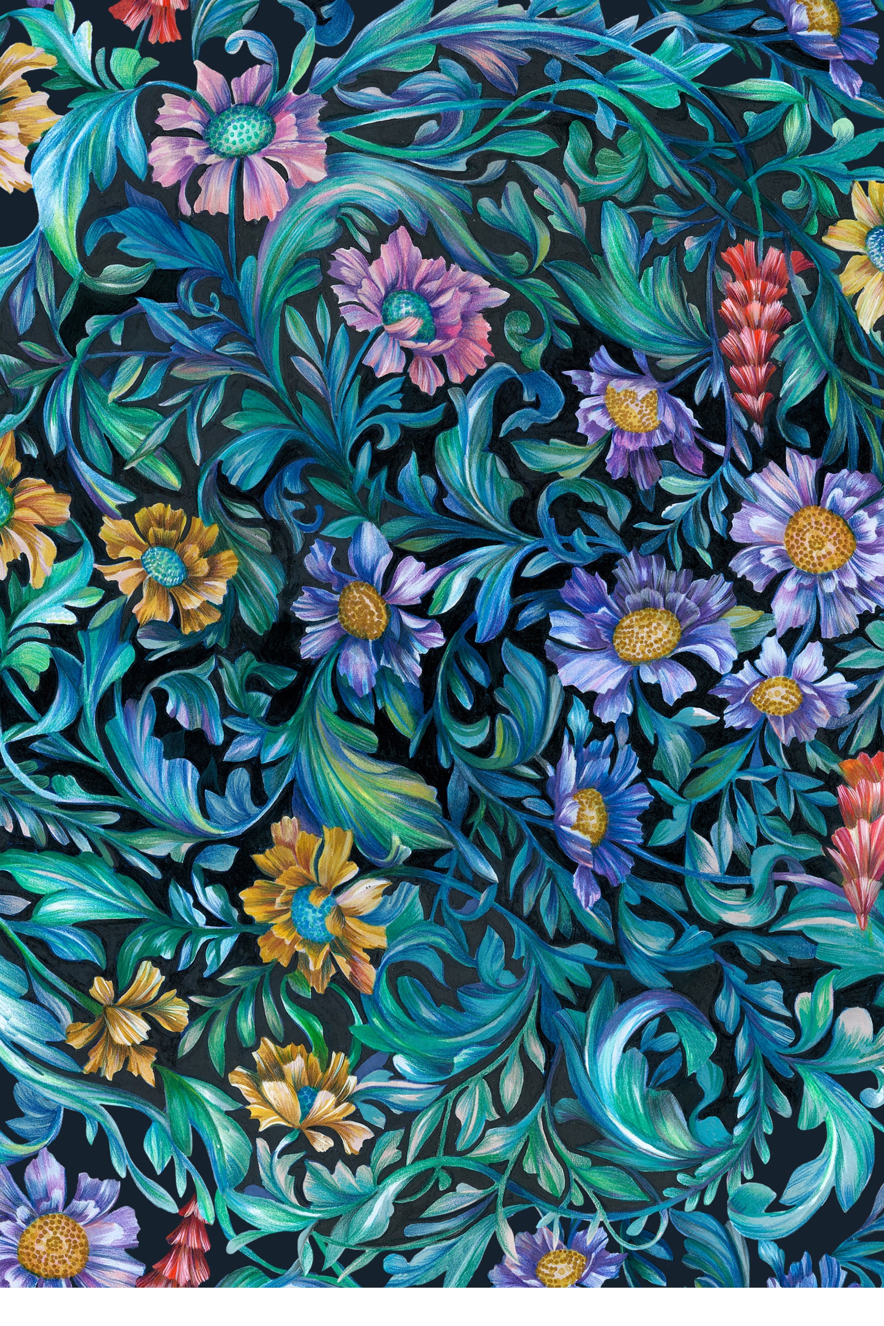 Moody, romantic, and rooted in Arts & Crafts influence, Midnight Garden features big blooms that twist and curl into one another. Its jewel-toned palette adds depth and edge, making this floral atmospheric and timeless.