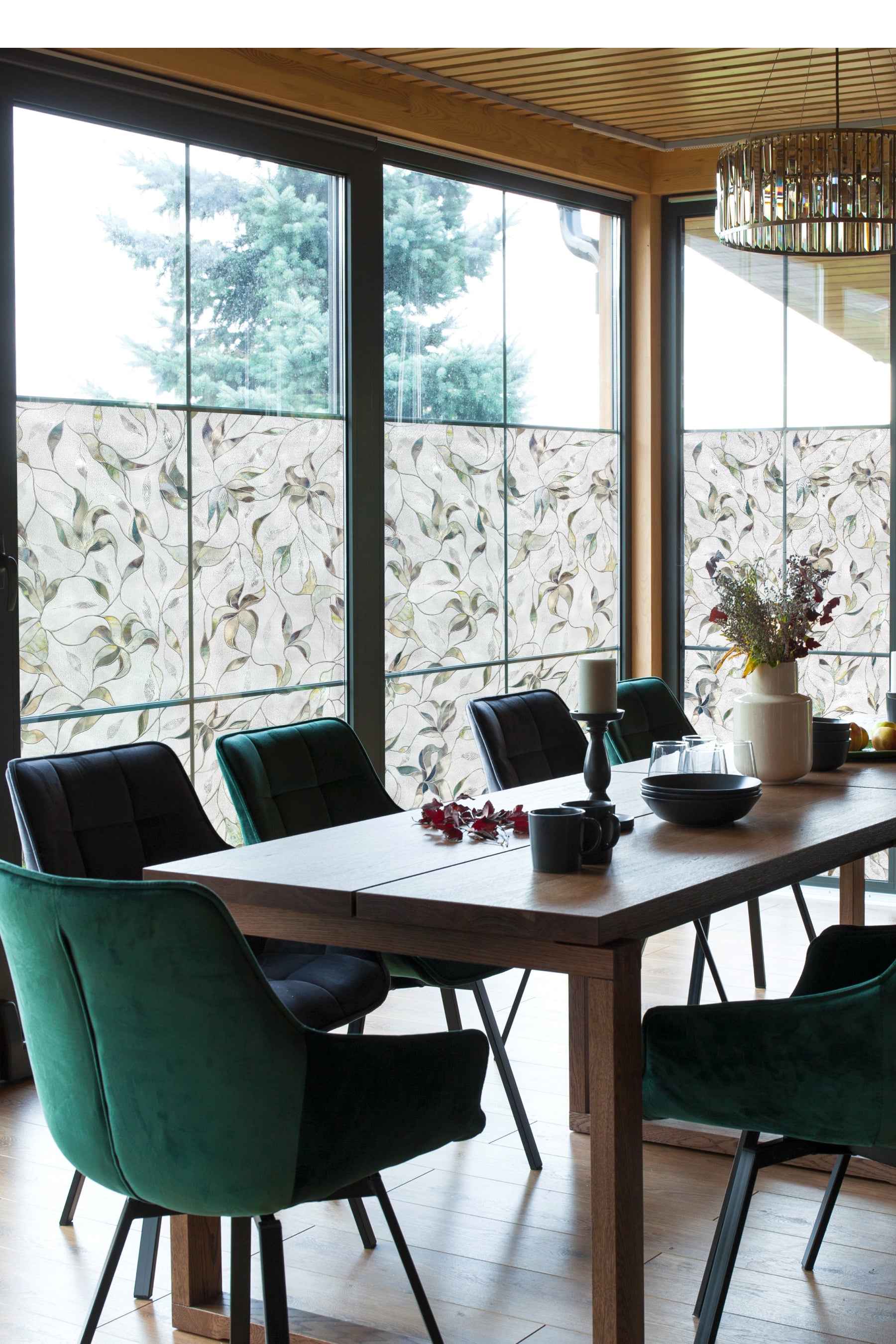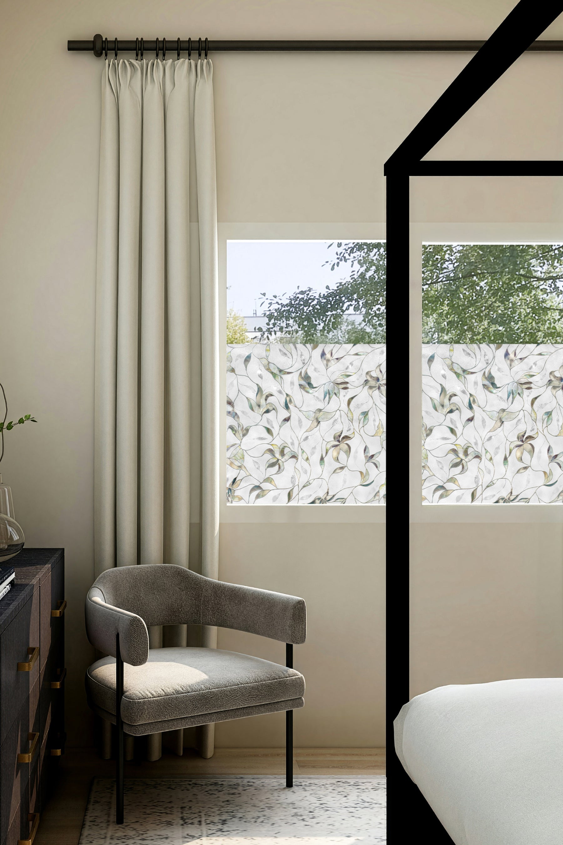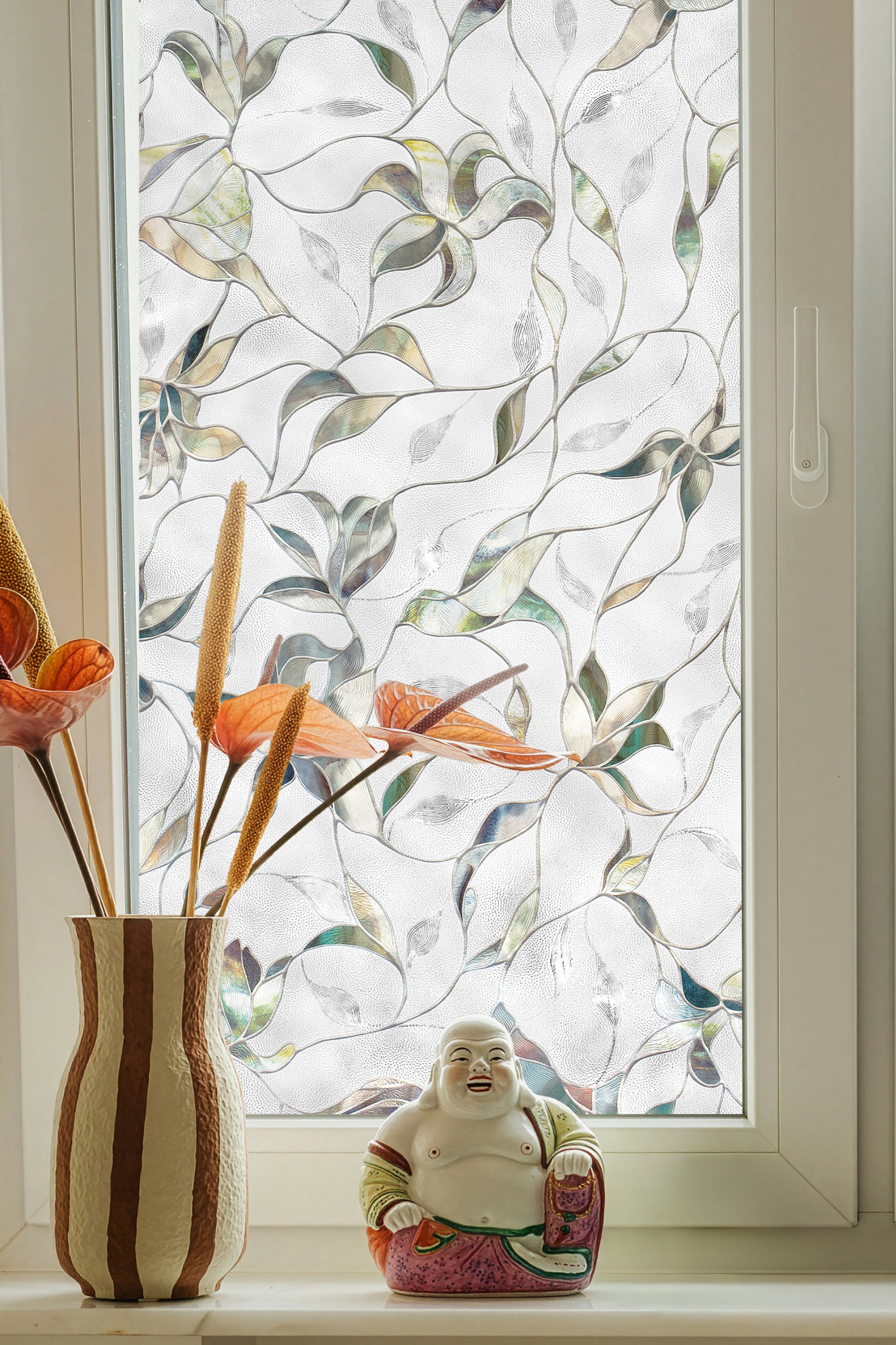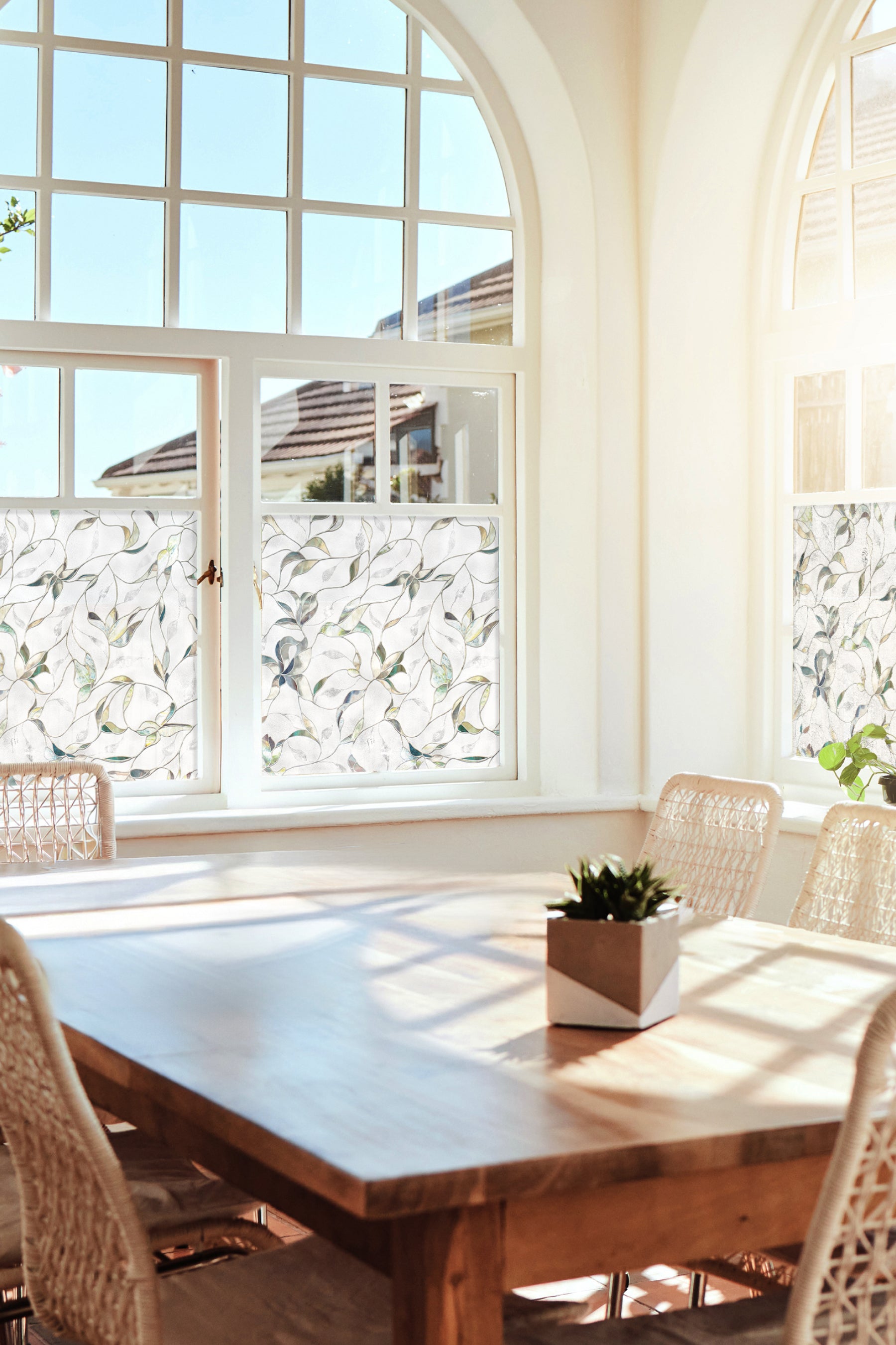 Light and airy, Flight adds sparkle and soft bits of color to the home. If you look closely, hidden imagery of birds and butterflies can be found throughout this stylized design. A lovely addition to a children’s room or kitchen window.