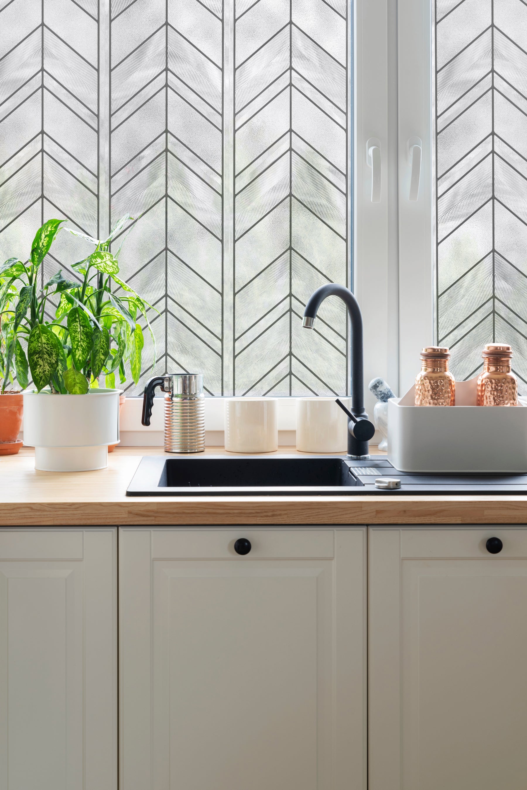 A fresh take on the classic chevron pattern, this design features nuanced textures of delicate stripes and dots. It brings understated elegance to any space, from kitchens to front doors.