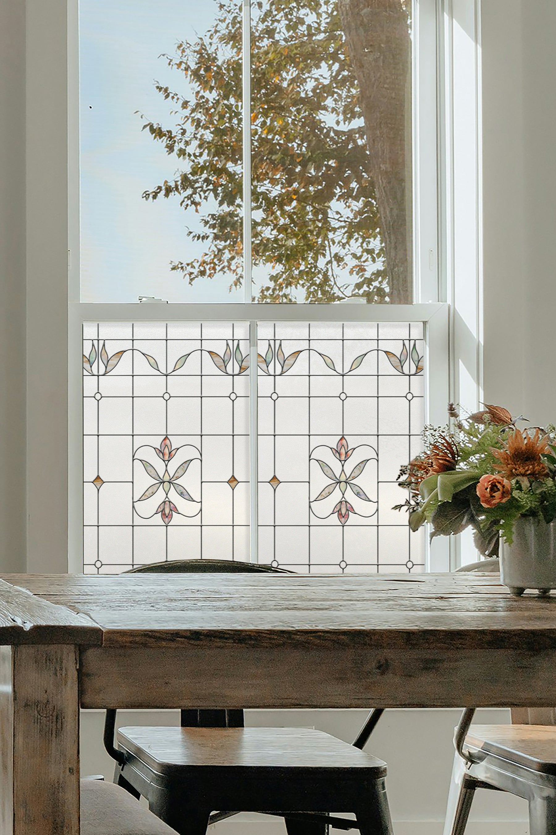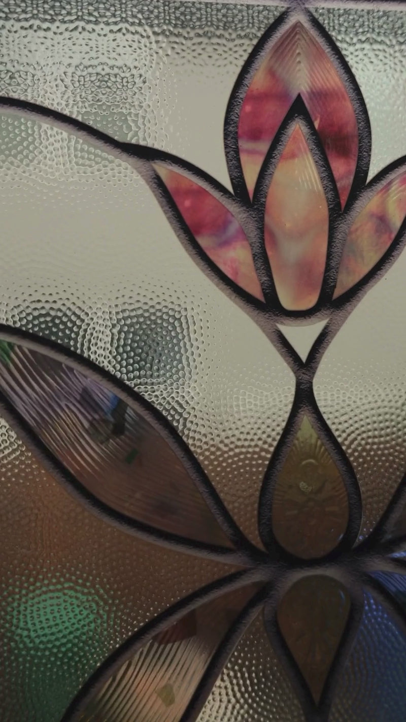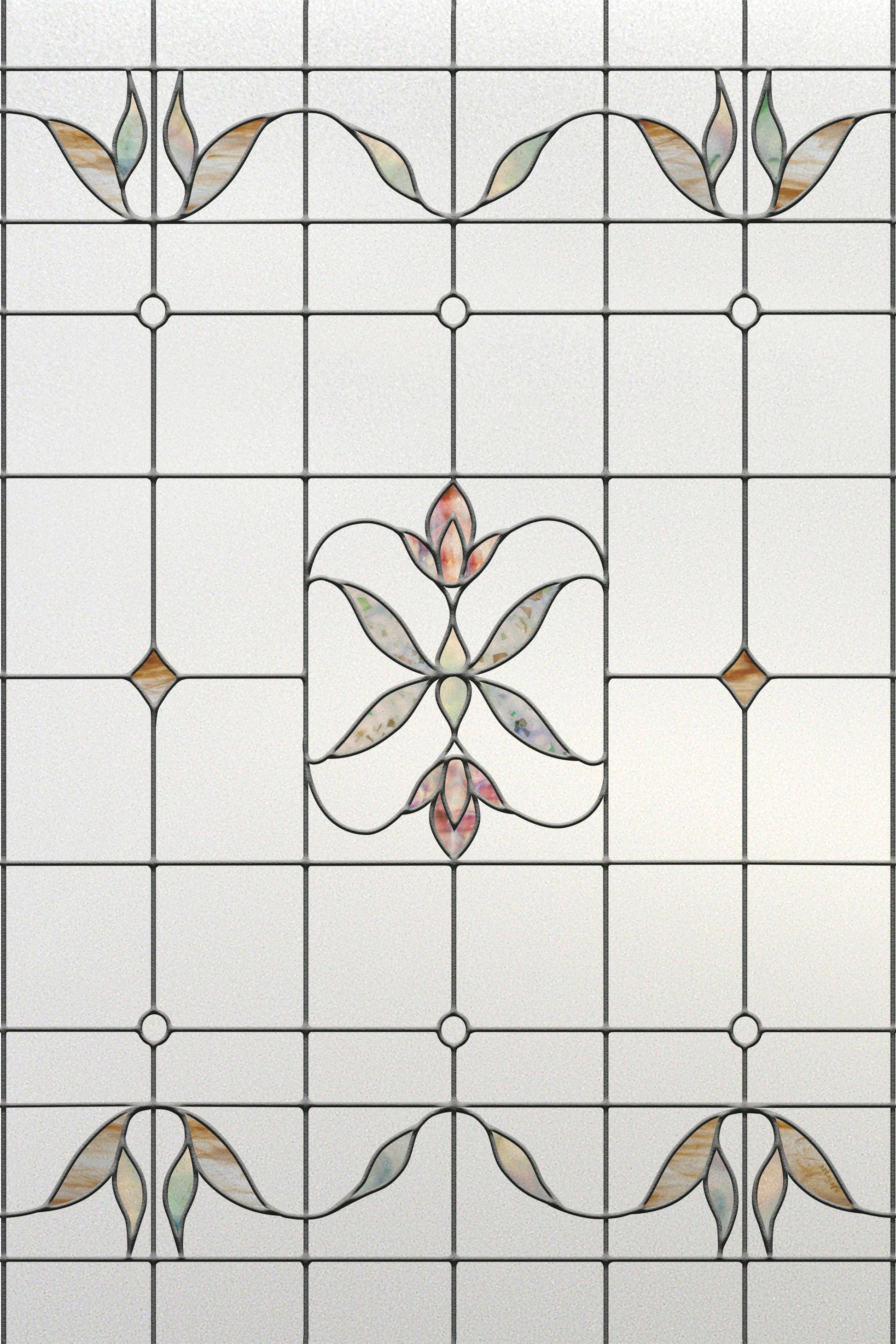 A feminine leaded glass design that looks lovely in a large window or narrow long window. Features confetti glass and hints of pink and soft red with sparkling textures throughout.