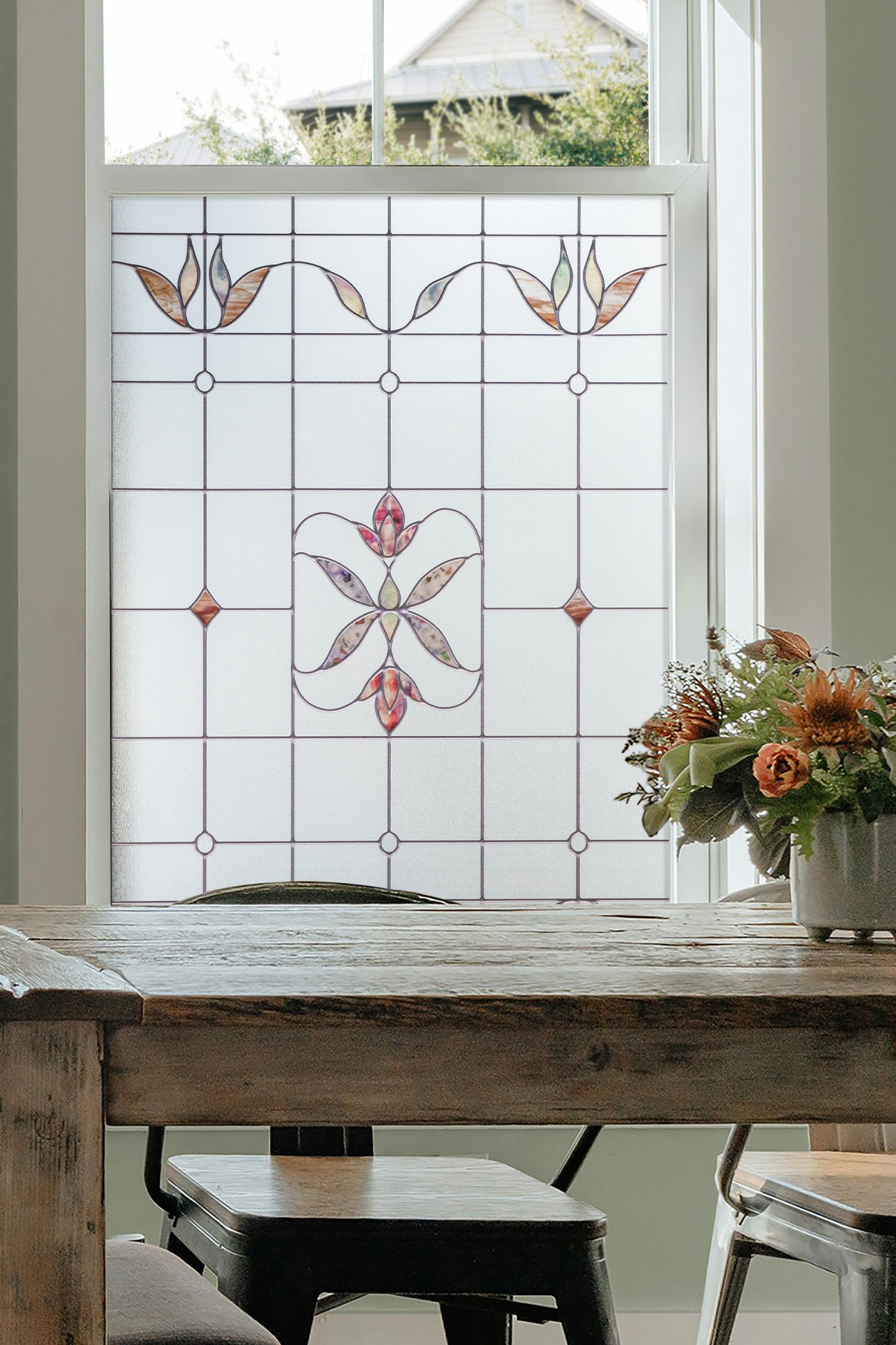 Heritage is a decorative leaded stained glass window film designed to provide privacy while allowing natural light to filter through. A classic design that feels at home in statement windows. Confetti glass details catch the light, while soft pinks, muted reds, and subtle sparkle create a shifting glow throughout the day.