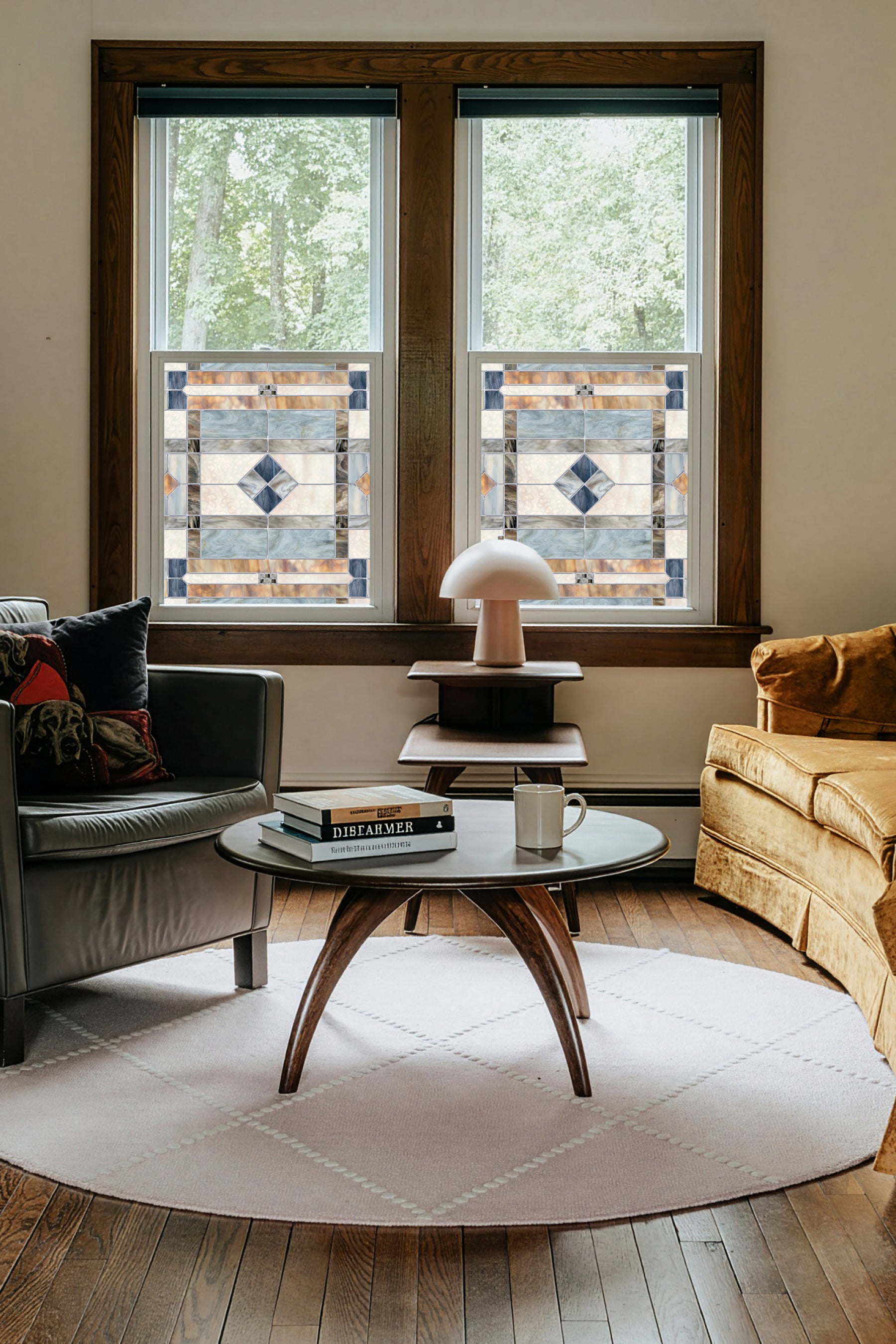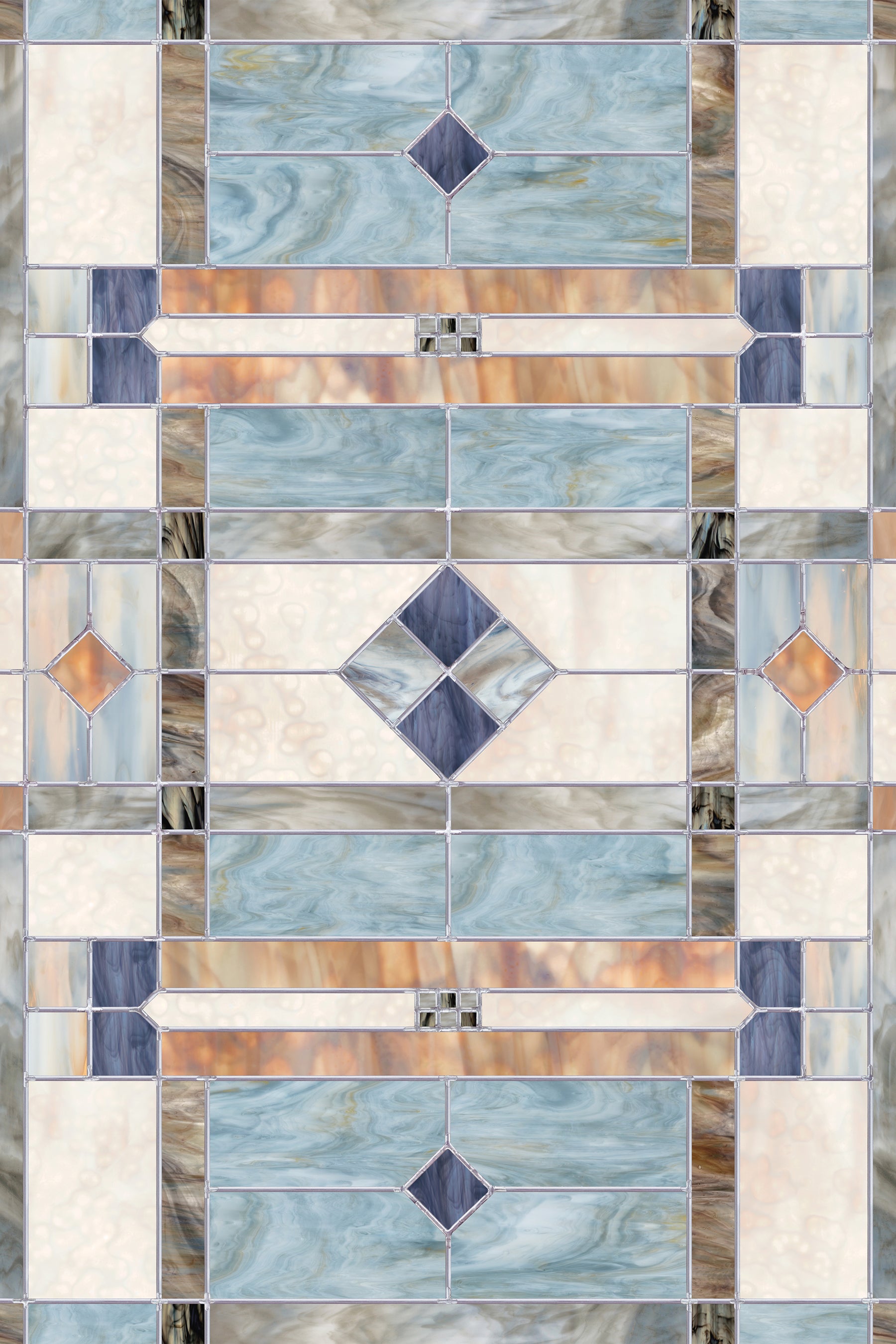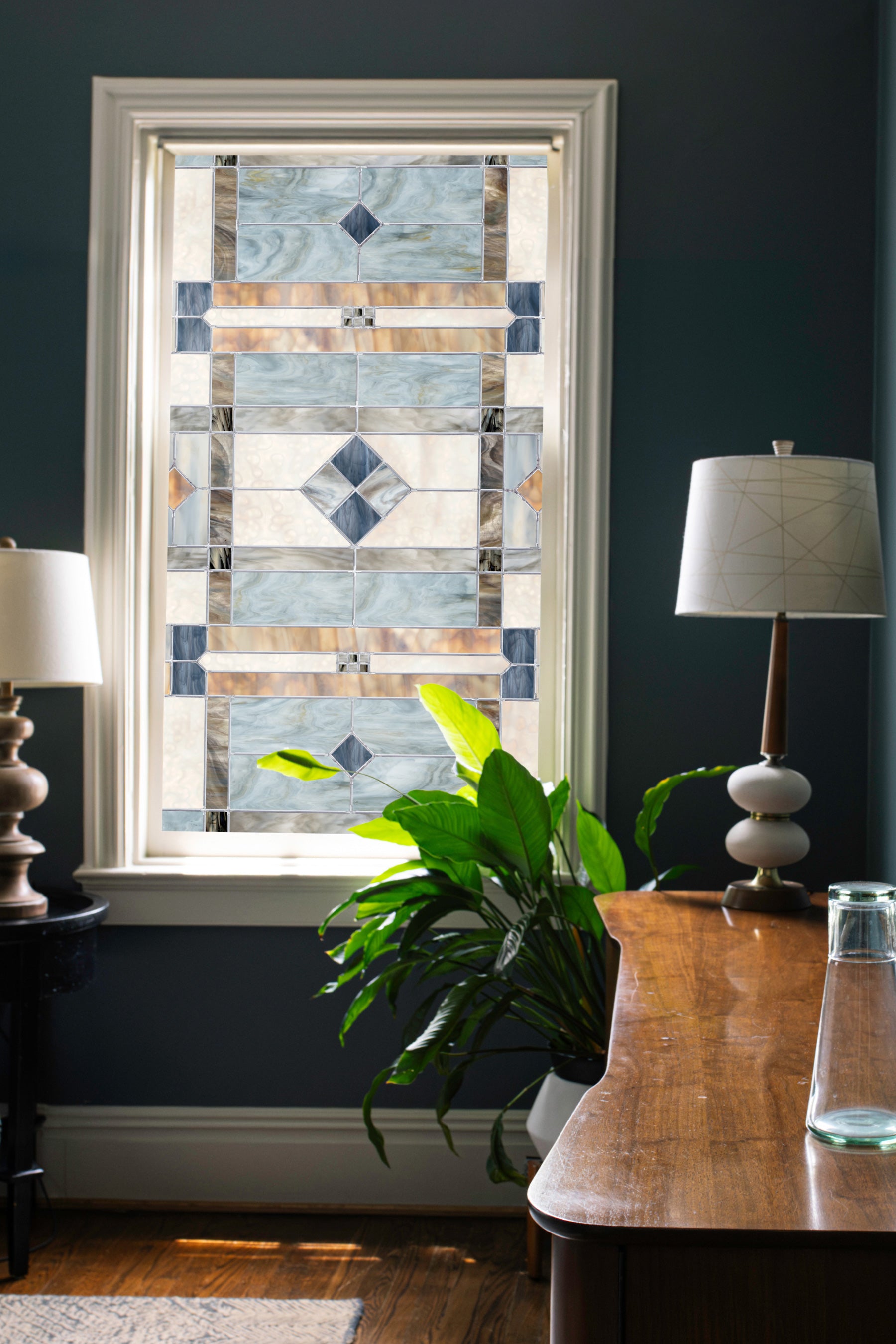 Rochester is a higher privacy decorative window film, refreshed in modern blues and gentle neutrals. Inspired by real stained glass and the work of Frank Lloyd Wright, the pattern features clean geometric shapes and a classic center motif. The colors create a soft, shifting glow while still letting natural light pour in. Rochester fits beautifully in more traditional spaces and looks perfectly at home on windows and glass doors in Craftsman style houses.