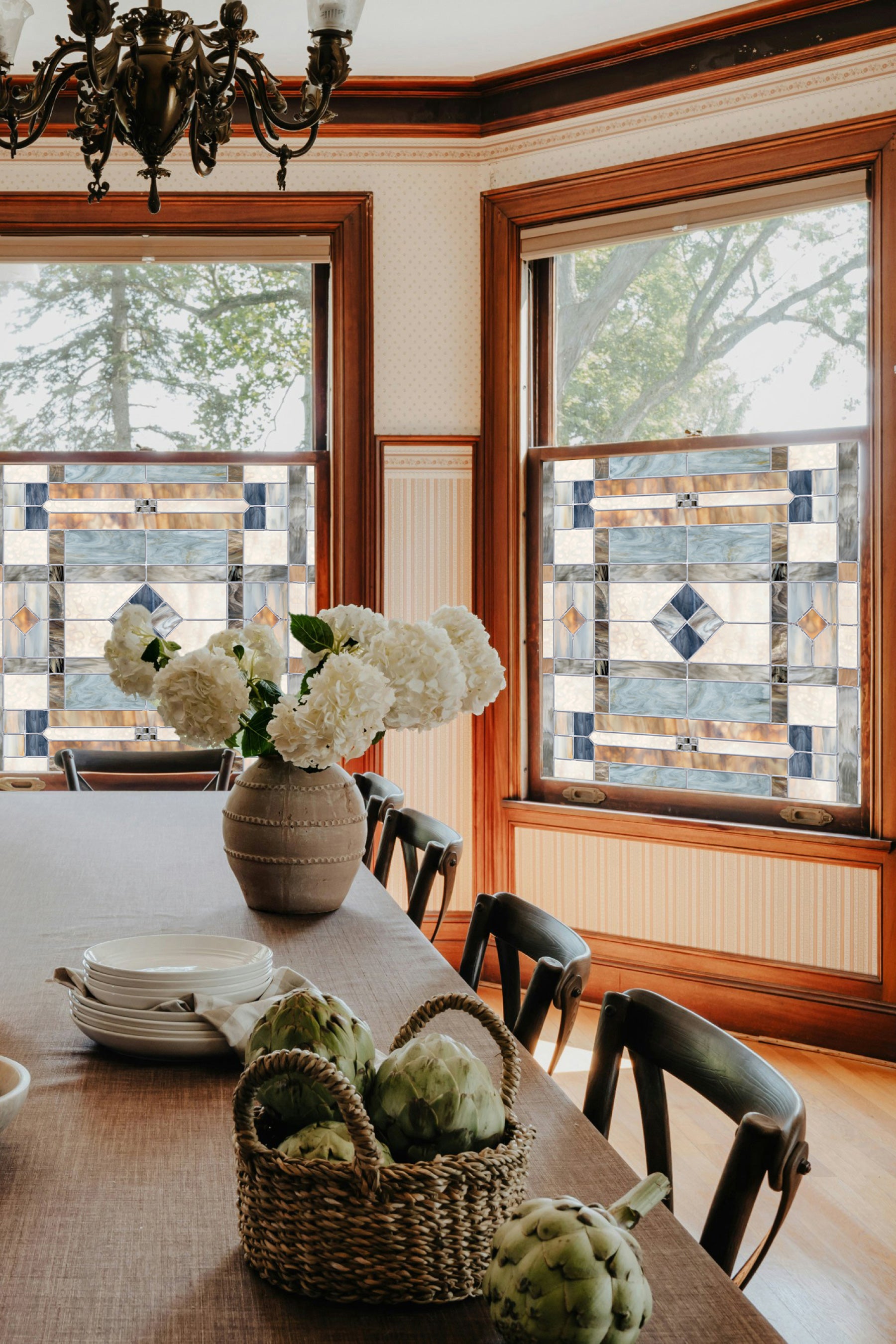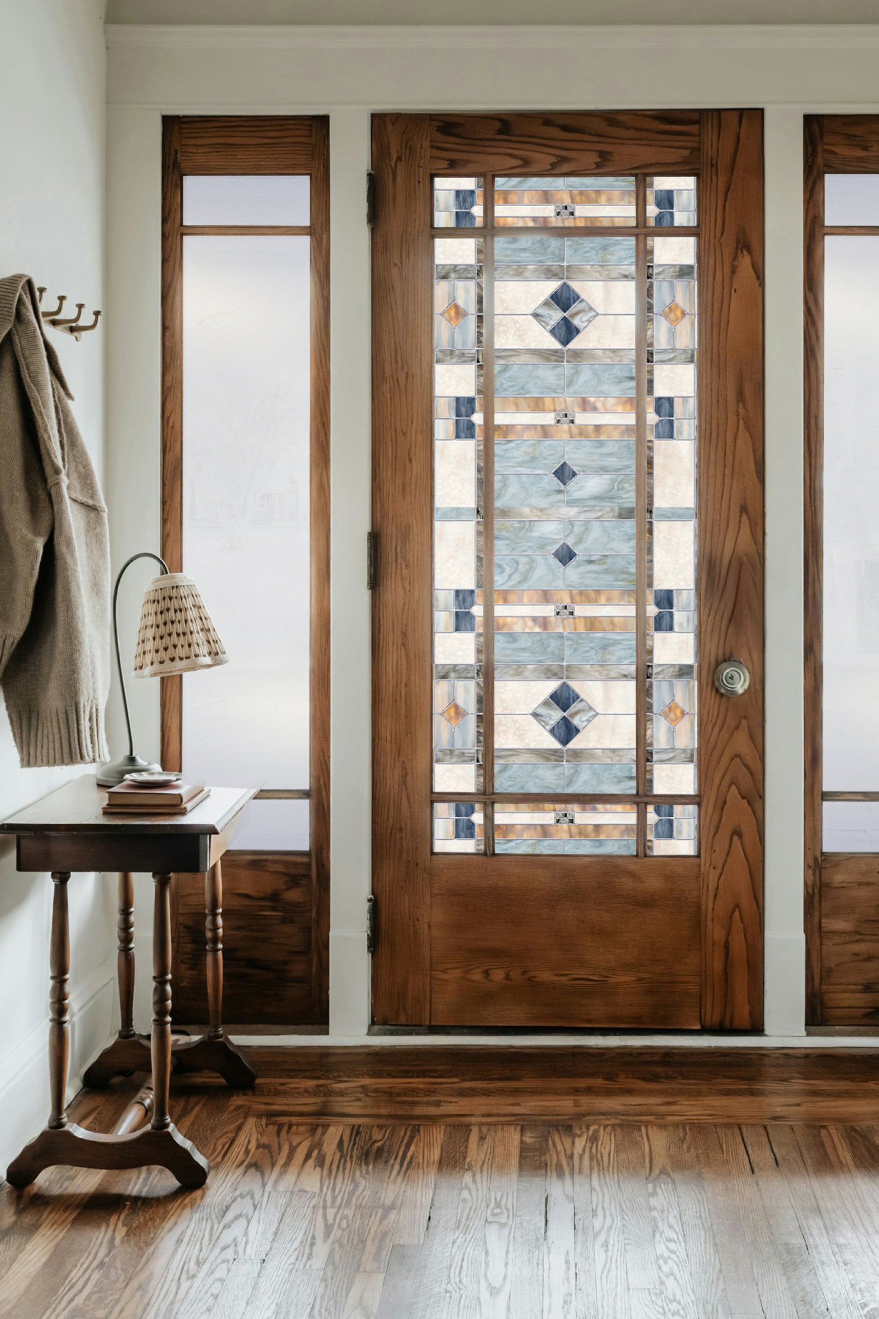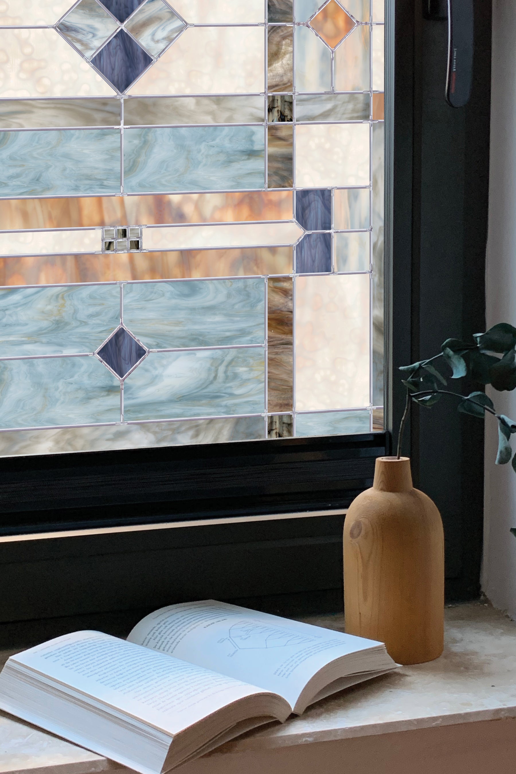 Rochester is a higher privacy decorative window film, refreshed in modern blues and gentle neutrals. Inspired by real stained glass and the work of Frank Lloyd Wright, the pattern features clean geometric shapes and a classic center motif. The colors create a soft, shifting glow while still letting natural light pour in. Rochester fits beautifully in more traditional spaces and looks perfectly at home on windows and glass doors in Craftsman style houses.