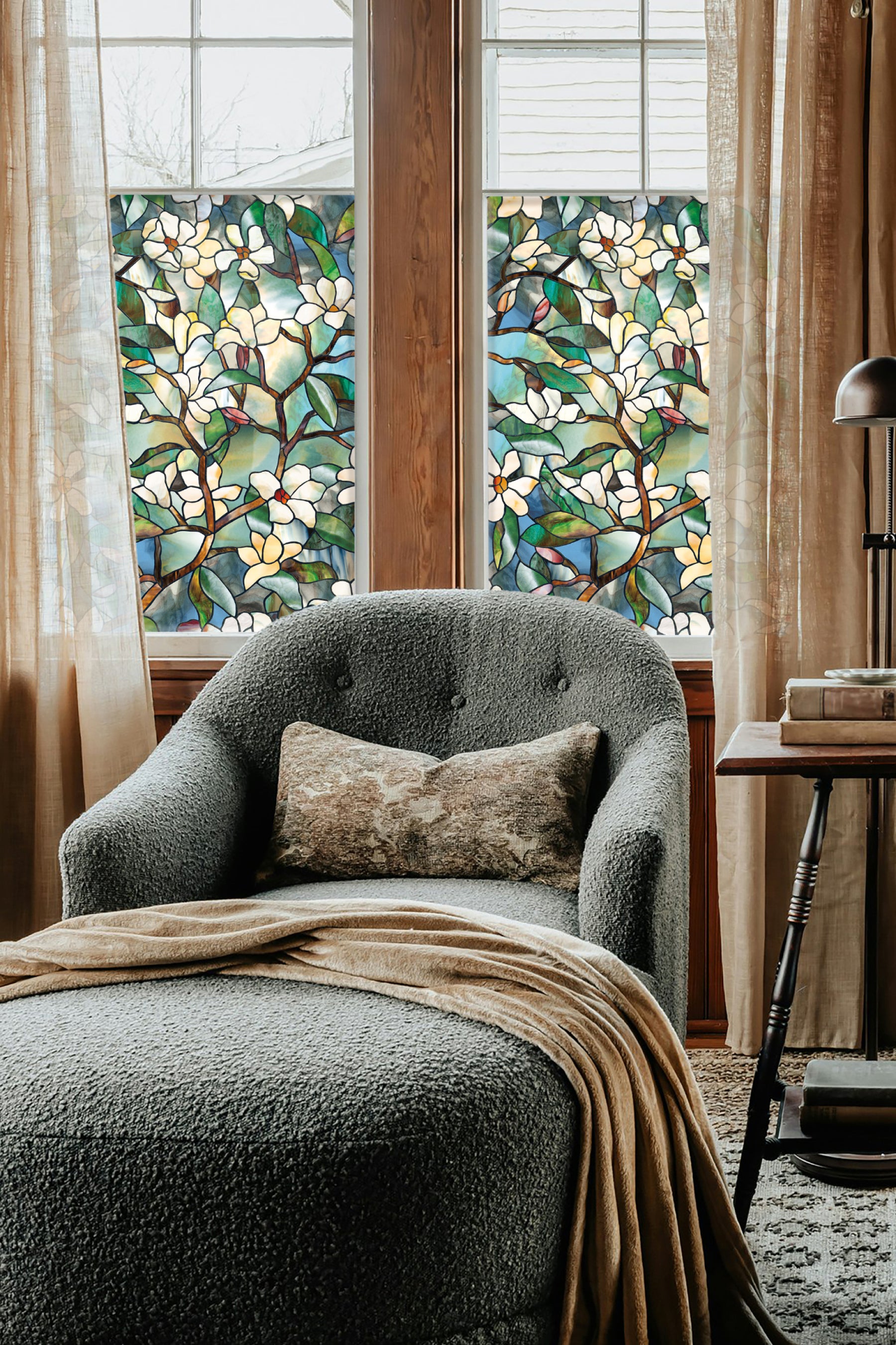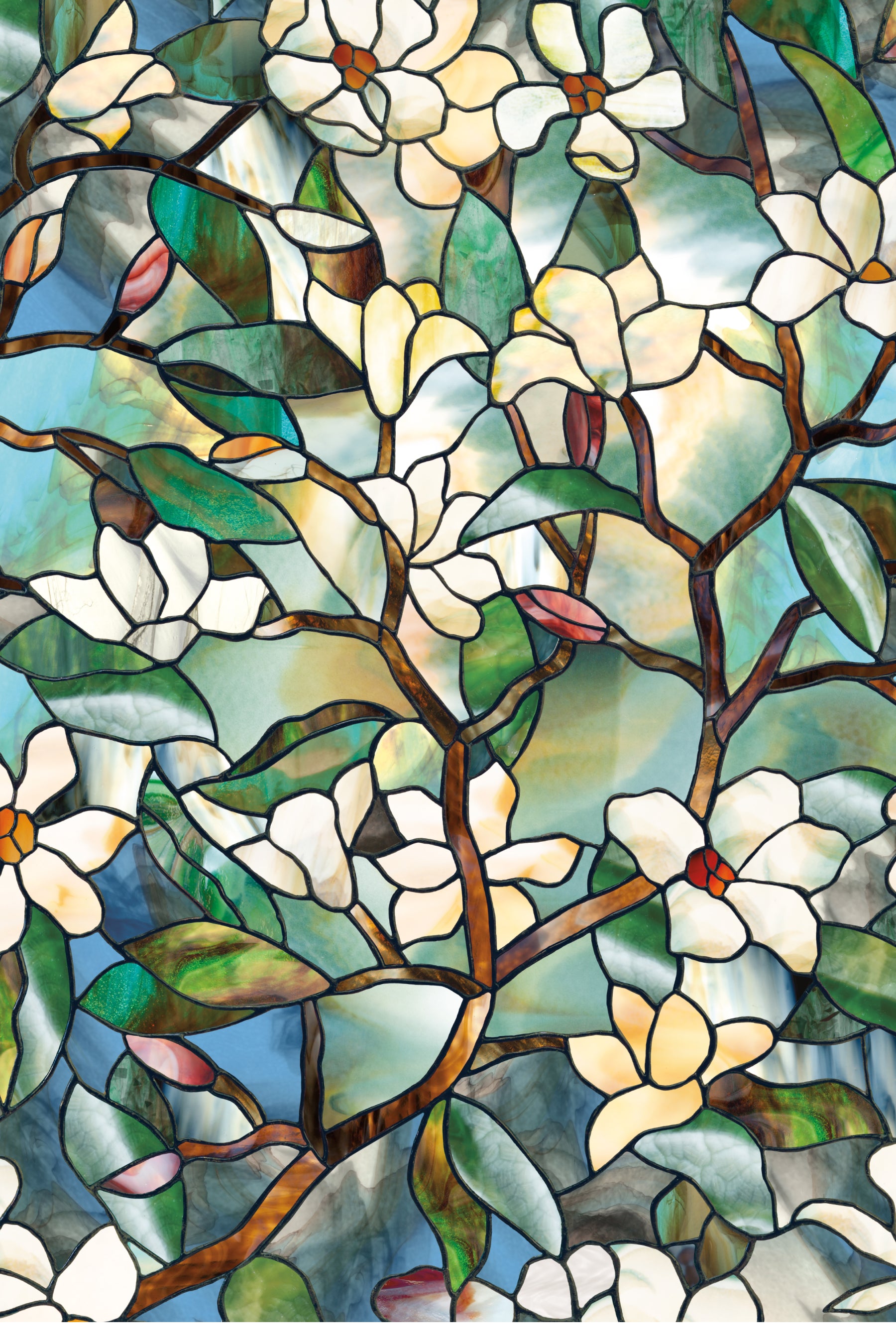 A fresh recolor of our bestselling Magnolia, Winter Magnolia pairs white and golden blooms with calm, grounding blues and greens. Inspired by real stained glass, it brings brilliant detail and luminous privacy to any room, an elegant seasonal twist with year-round appeal.